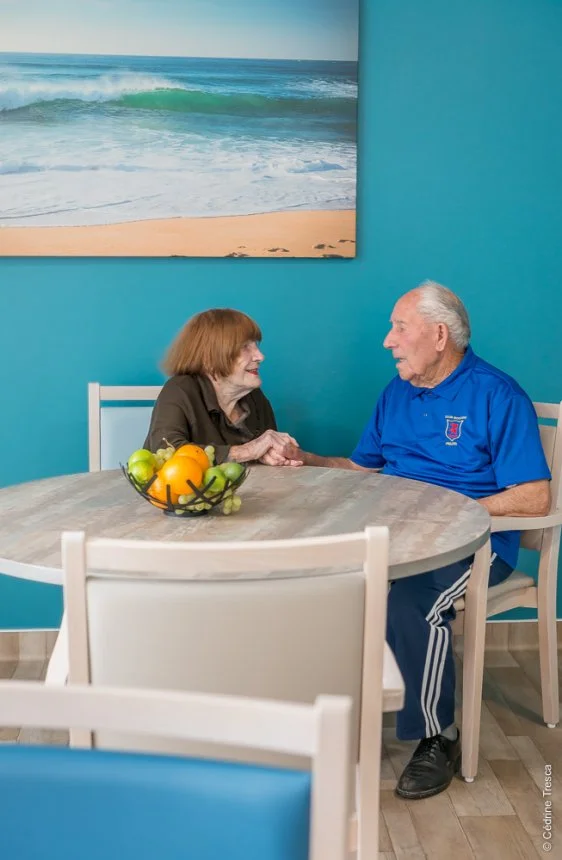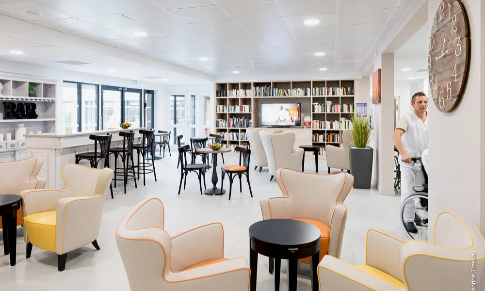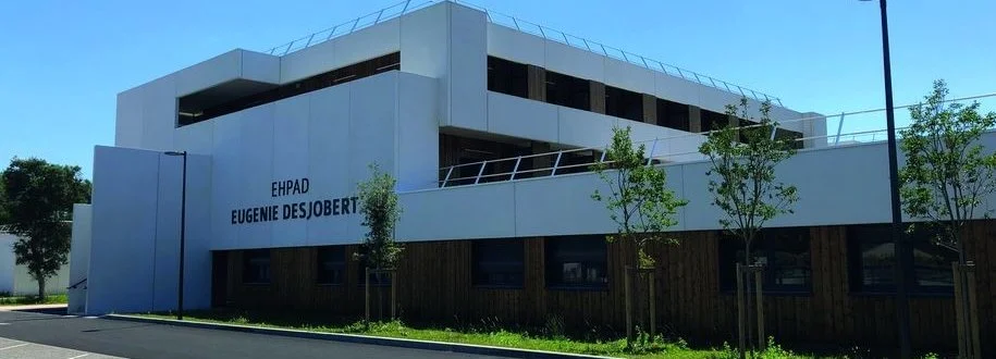 Nous arrivons devant un très beau bâtiment moderne et chaleureux. L’Ehpad a ouvert il y a seulement six semaines et déjà, nous ressentons un lieu très vivant et joyeux.