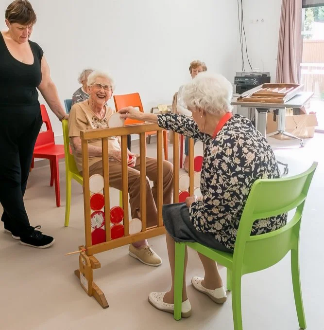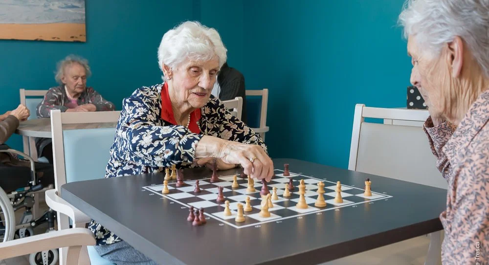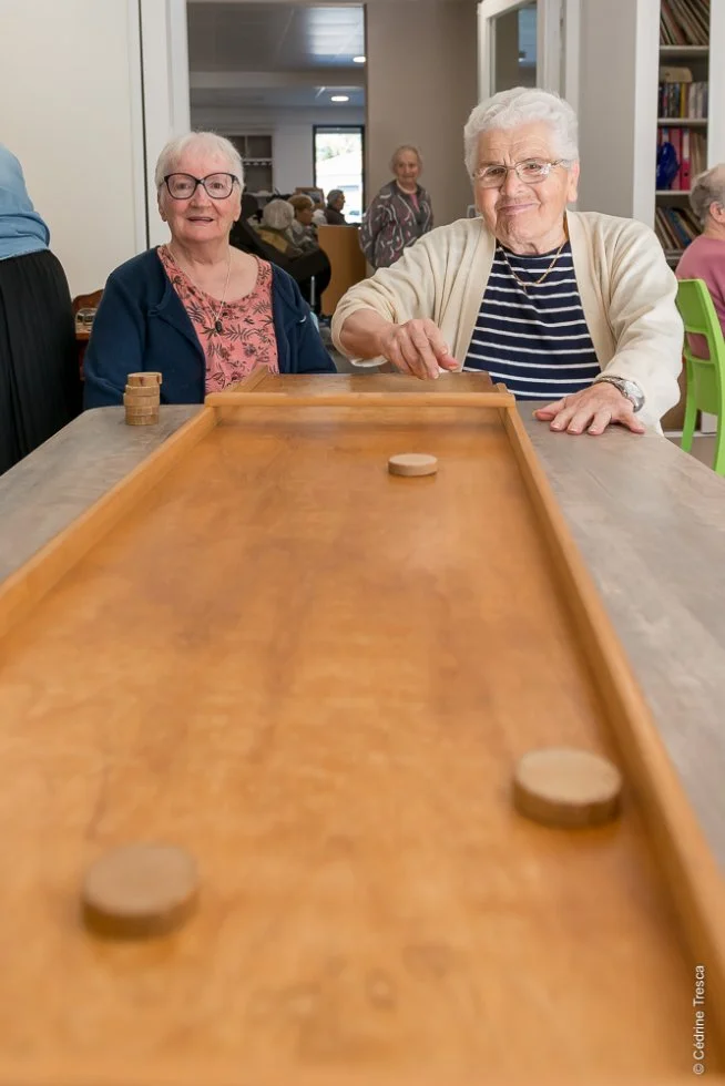 Nous terminons notre reportage photos en passant du temps dans la salle d’animation où les activités proposées sont très diverses et très suivies. Nous avons raté le cours de cuisine spécial madeleines de la veille mais nous sommes ravies de participer à l’activité Jeux anciens. De très grands et nombreux jeux en bois sont proposés aux résidents. Puissance 4 géant, Grenouille ou autre billard hollandais, Il y a le choix pour s’amuser cette après-midi.