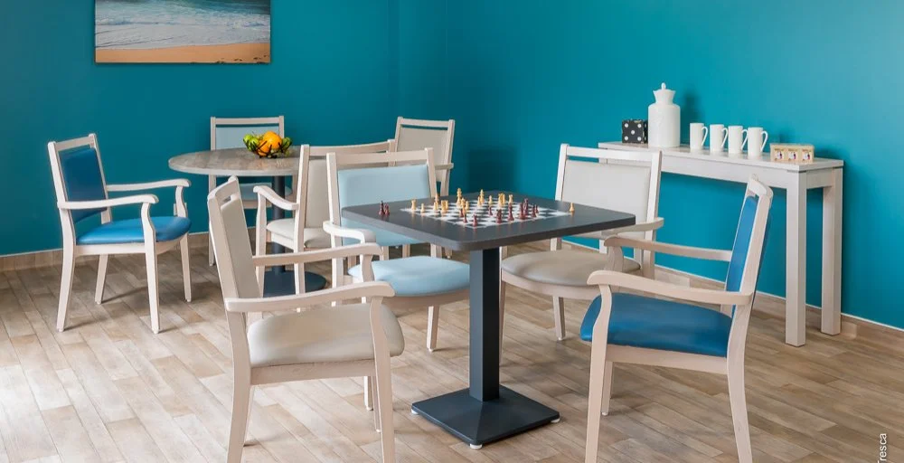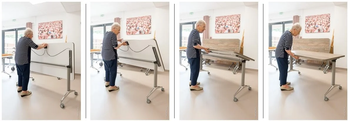 La salle d’animation change tous les jours d’activité. Elle reçoit un nombre très variable de participants. Elle doit donc être modulable facilement et en un rien de temps. Grâce à la simplicité d’utilisation de la table modulo, elle peut être salle de jeux, cuisine, salle de gym, salle de chants etc… la table modulo est si facile que ce sont souvent les résidents qui les déplacent.