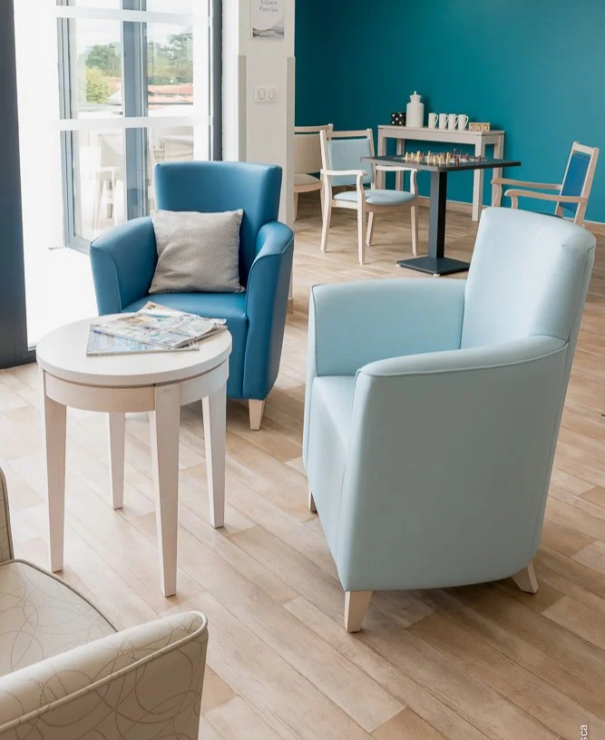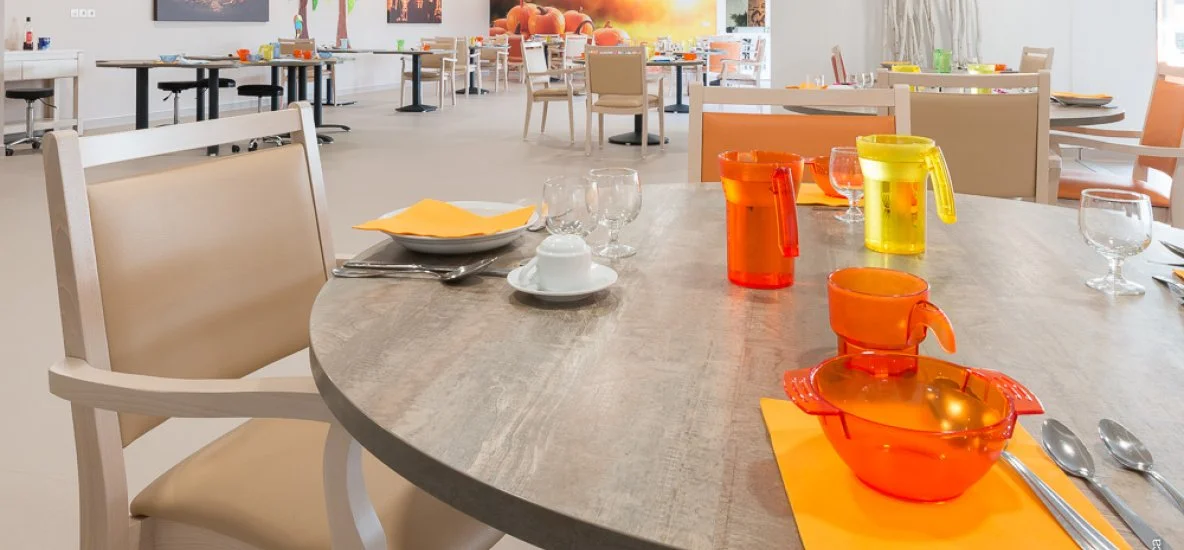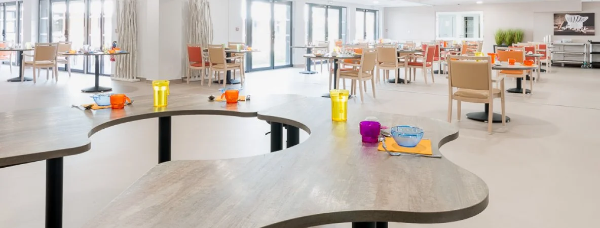 La volonté ici comme dans tout l’établissement était de privilégié le maintien de l’autonomie des résidents mais aussi la prévention des soignants face aux facteurs de risque des TMS. C’est pourquoi tout le mobilier, bridges et tables, est doté du concept Ergomodel Gliss, le patin qui permet de déplacer le lourd mobilier sans effort et par une seule personne. Cette innovation offre aussi au résident la liberté de ses mouvements puisqu’elle facilite son dégagement de la table. Ici tout le mobilier en bénéficie. Toujours dans cet esprit de proposer des solutions simples dans le travail quotidien du personnel, la table Pétale permet d’assister simplement les personnes lors de la prise du repas.