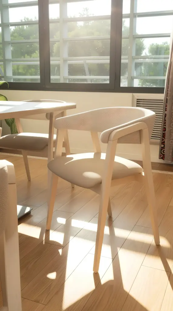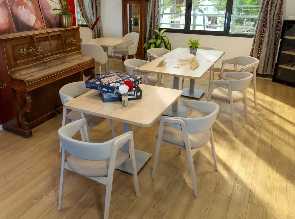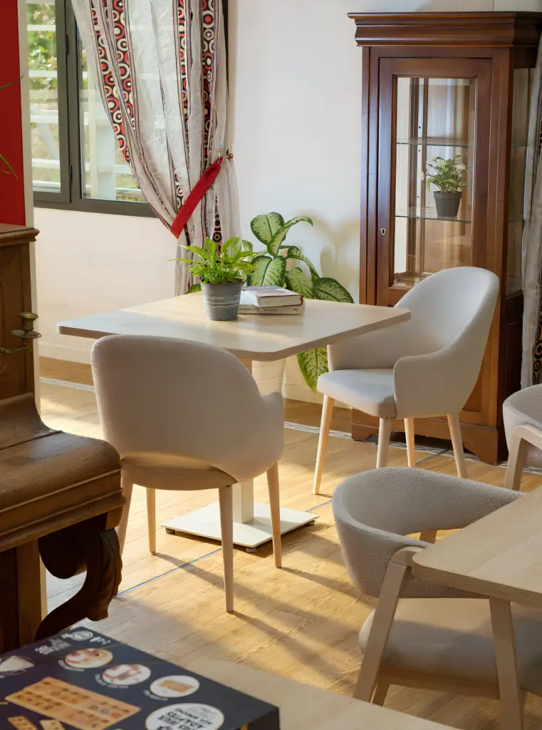 Autour des tables, les chaises Claude et Hans au design doux et contemporain créent un espace où l’on imagine facilement des moments d’échanges : un café du matin, un atelier, un jeu de société, un simple sourire échangé entre voisins. Le mobilier devient support du lien social, facilitateur de moments humains.