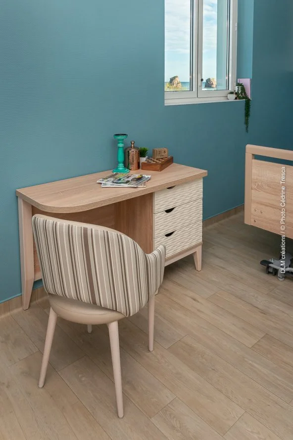 C’est notre lit médicalisé Ergomodel Genius qui équipe les chambres de l’unité Morencé, accompagné de la gamme Idavol, sublimée par une finition « vague », qui rend hommage aux formes et aux couleurs de l’océan que l’on peux apercevoir des fenêtres des espaces privés.