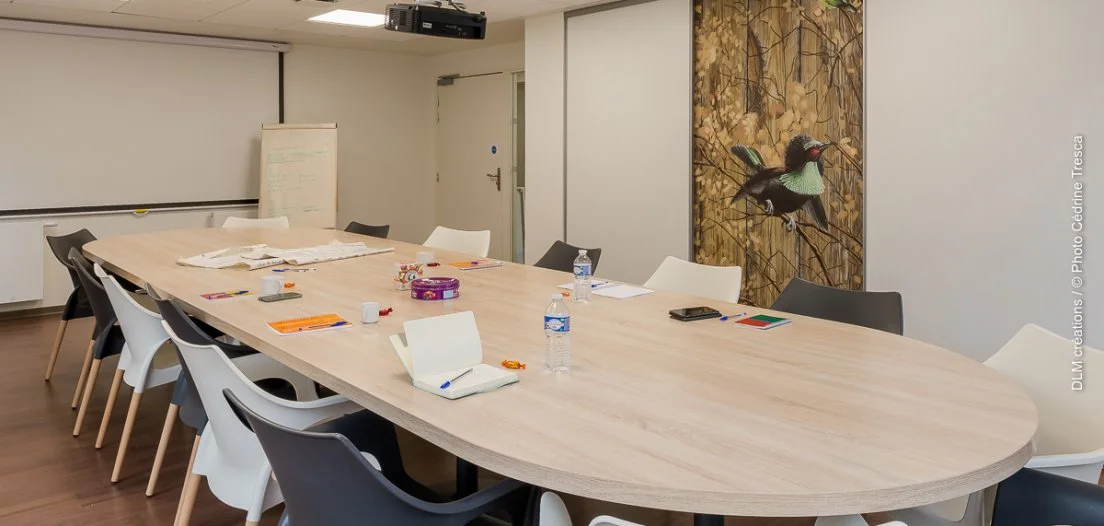Offrir aussi un cadre de travail agréable, c’est la volonté de l’EHPAD Jean Péridier, et la salle de réunion répond à cette envie. L’accord harmonieux entre couleurs neutres et matières naturelles vient adoucir l’espace et proposer une ambiance chaleureuse.
