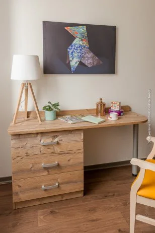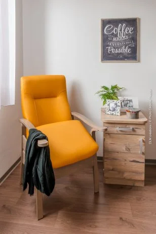 Dans la chambre, le coloris vif choisi pour le revêtement de notre fauteuil Ergomodel Easy-Up s’allie avec brio aux teintes naturelles et douces choisies pour notre chevet et bureau commode de la gamme Sonate. Un coup d’éclat pour se sentir comme chez soi.