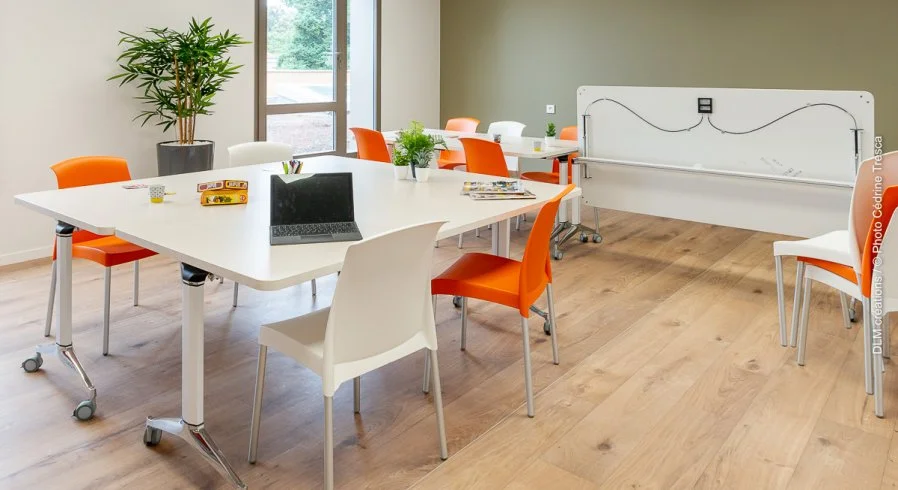 En entrant dans cette salle de réunion, nous sommes immédiatement marquées par l’atmosphère énergisée qui s’en dégage. L’alliance harmonieuse entre l’orange et le blanc donne un coup d’éclat à l’ensemble de la pièce.