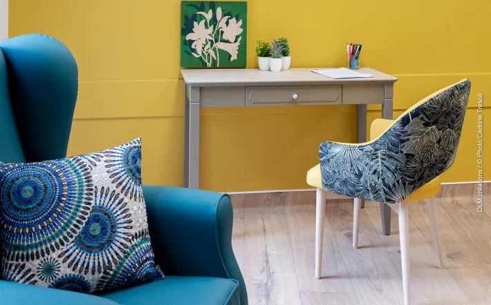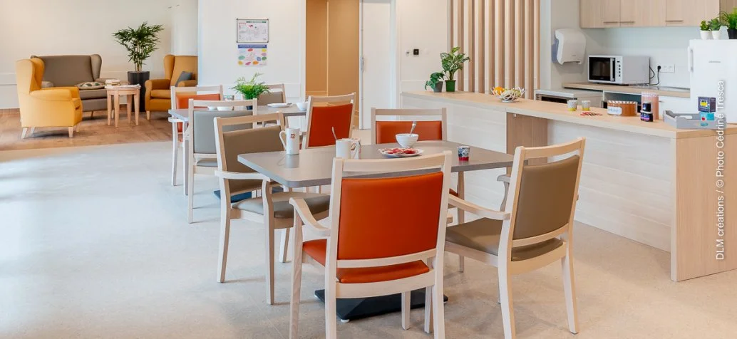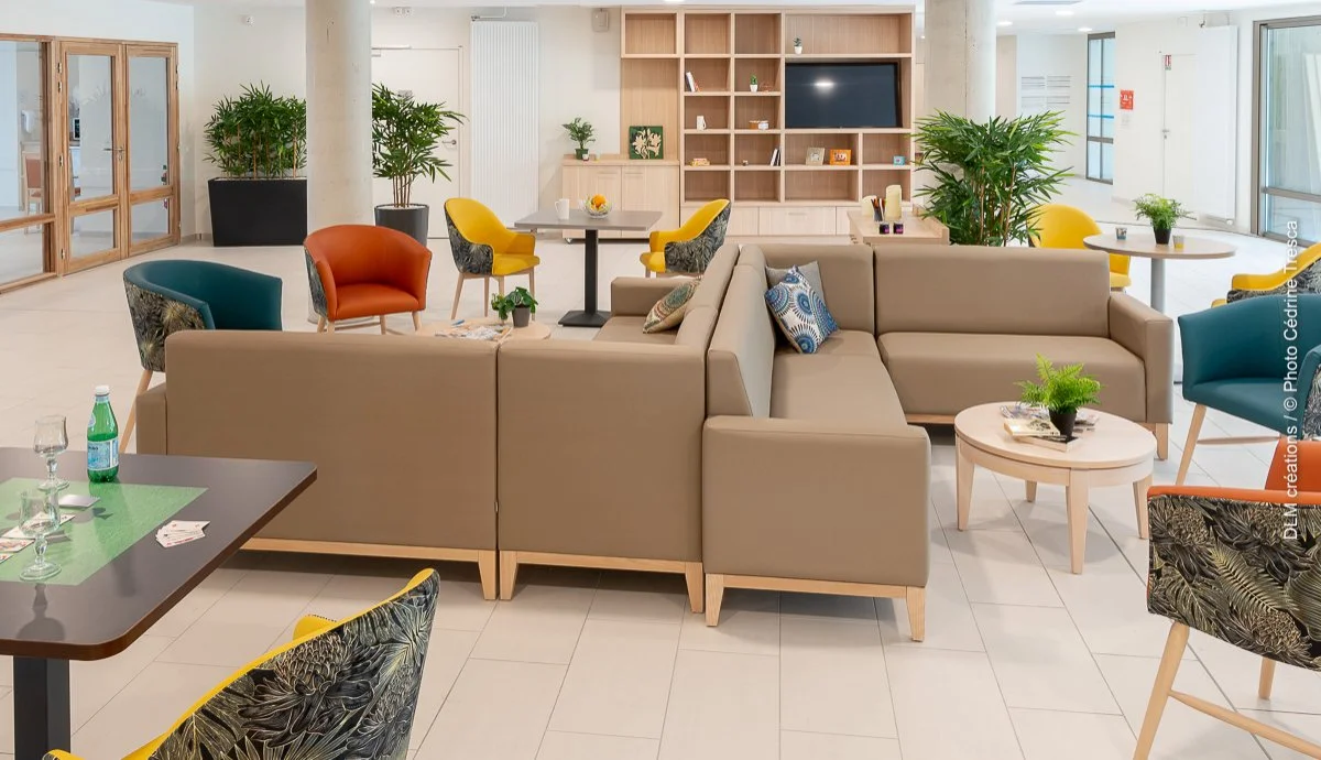 Les espaces communs ouverts sur l’extérieur offrent à cette unité de vie protégée une ambiance cosy et reposante.