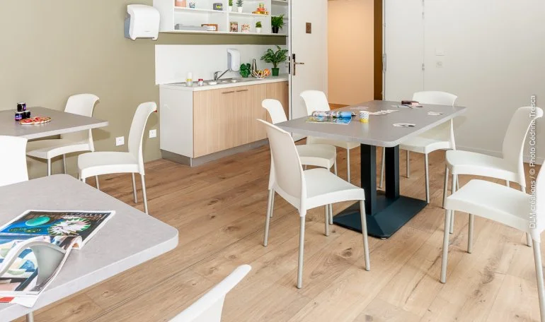 La salle à manger principale de l’EHPAD La Sarra nous plonge dans une ambiance lumineuse et chaleureuse. Entourée par des baies vitrées donnant sur un extérieur à la végétation luxuriante, cette salle de restauration nous offre un décor apaisant et rassurant.