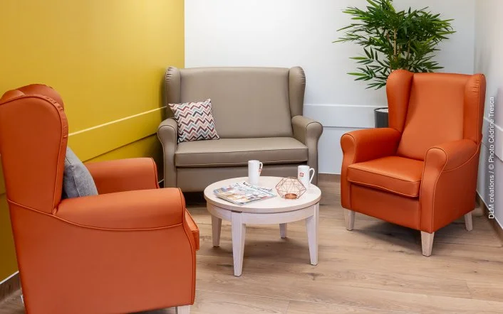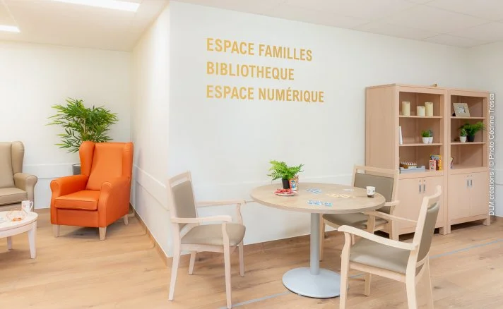Organisé comme le salon d’une maison, l’espace des familles de l’établissement est ouvert sur la place du village. Grandes bibliothèques, canapés et fauteuils confortables, on y retrouve tous les codes d’un espace accueillant et agréable. Une invitation à partager un moment de convivialité en famille ou entre résidents.